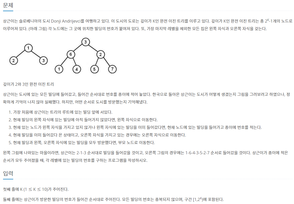 상근이는 슬로베니아의 도시 Donji Andrijevci를 여행하고 있다. 이 도시의 도로는 깊이가 K인 완전 이진 트리를 이루고 있다. 깊이가 K인 완전 이진 트리는 총 2K-1개의 노드로 이루어져 있다. (아래