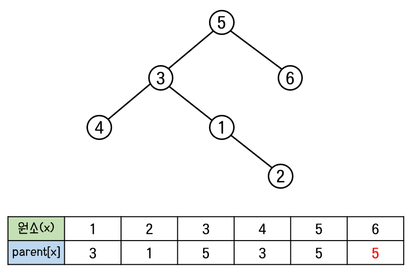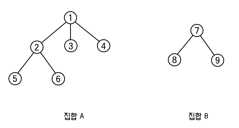 어떠한 집합을 표현할 때는 그 집합에 해당하는 트리의 루트 노드의 번호로 나타낸다.