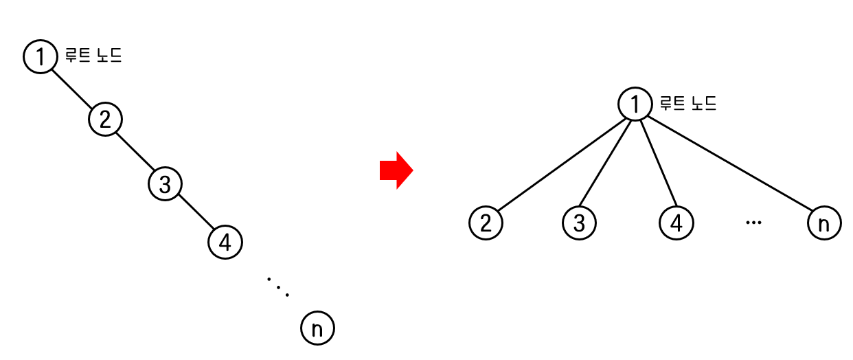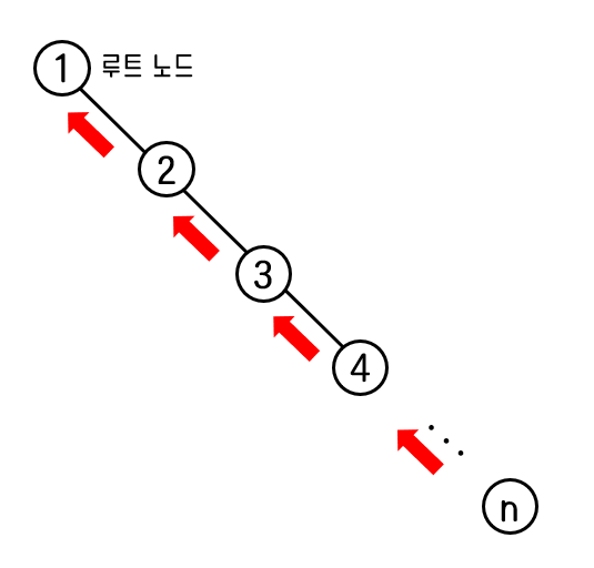 이렇게 트리가 비대칭 구조를 이루는 경우에는 최악의 경우가 되어 시작복잡도가 O(n)이 된다.