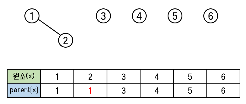 원소2가 속한 집합과 원소1이 속한 집합이 하나의 집합으로 합쳐지기 위해 1번 노드와 2번 노드가 연결되어야 한다. 같은 트리에 속한다는 것은 하나의 집합임을 의미하기 때문이다.