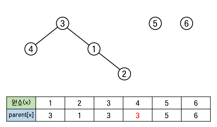 원소 1, 2, 3, 4, 5, 6이 존재한다. 그리고 처음에 초기화를 통해 6개의 원소는 각각의 집합을 이루게 된다.
