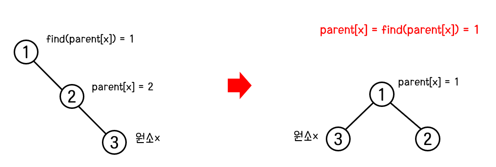 재귀를 통해 원소x의 부모 노드(parent[x])의 루트 노드를 찾으면, 원소x의 부모 노드를 루트 노드로 변경한다. 아래 그림을 보자.
