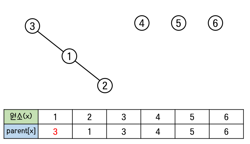 이렇게 함으로써 원소1, 2, 3이 하나의 트리를 이루어 하나의 집합으로 합쳐진다.