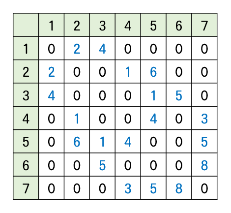 그래프에 N개의 노드가 있으면, N x N 이차원 행렬을 만들어서 노드와 노드 사이의 간선 가중치를 담는 방식이다. 그래프가 무방향 그래프이고, i노드와 j노드가 연결되어 있으며 둘 사이의 간선의 가중치가 w인 경우, graph[i][j] = graph[j][i] = w 로 나타낼 수 있다.