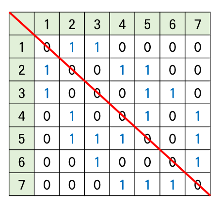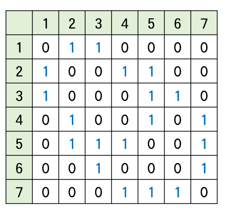 만약 그래프에 가중치가 주어지지 않은 경우에는 두 노드가 연결되어 있으면 1, 연결되어 있지 않으면 0 으로 나타내어 0과 1로만으로 연결관계를 표현할 수 있다. 혹은 boolean형으로도 표현이 가능하다.