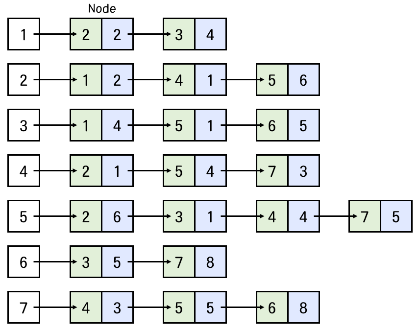 아래는 왼쪽의 그래프 연결관계를 인접 리스트로 나타냈을 때의 모습이다.