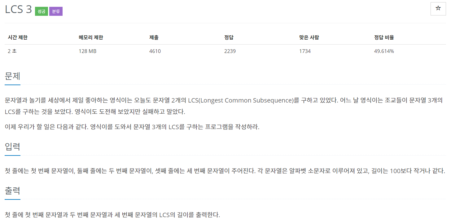 보통은 두 문자열의 LCS를 구하는데, 이 문제는 세 개의 문자열의 LCS를 구해야 한다.