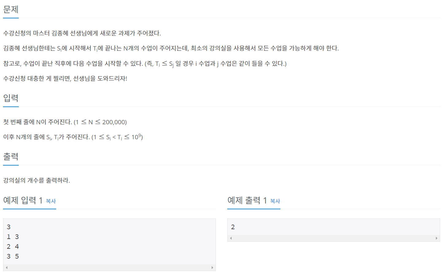 이 문제에서 구하고자 하는 것은 최소 사용할 수 있는 '강의실 수' 이다.