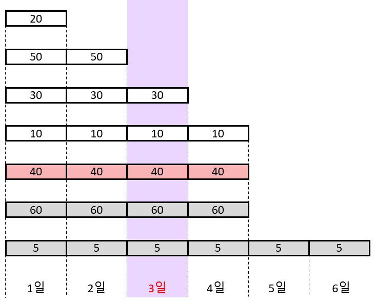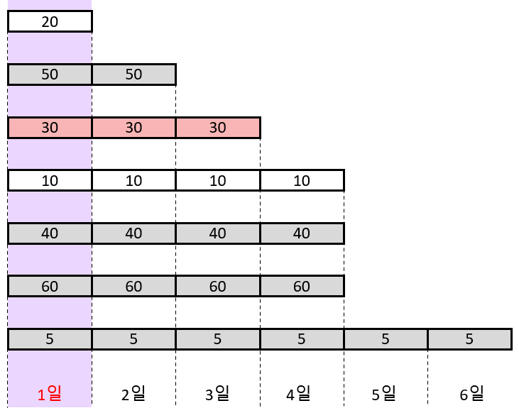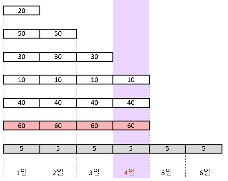 이 중에서 가장 큰 점수를 가지는 과제는 60점짜리 과제이다. 따라서 4일째에는 60점짜리 과제를 처리한다.