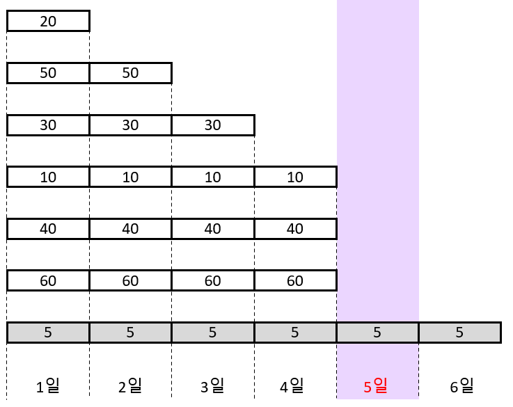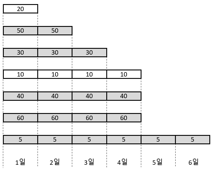 그 다음 5일째 처리할 수 있는 과제는 하나도 없다. 이미 5점짜리 과제를 해결했기 때문이다.