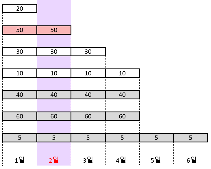 이 중에서 가장 점수가 큰 과제는 50점짜리이다. 따라서 2일째에는 50점짜리 과제를 처리한다.