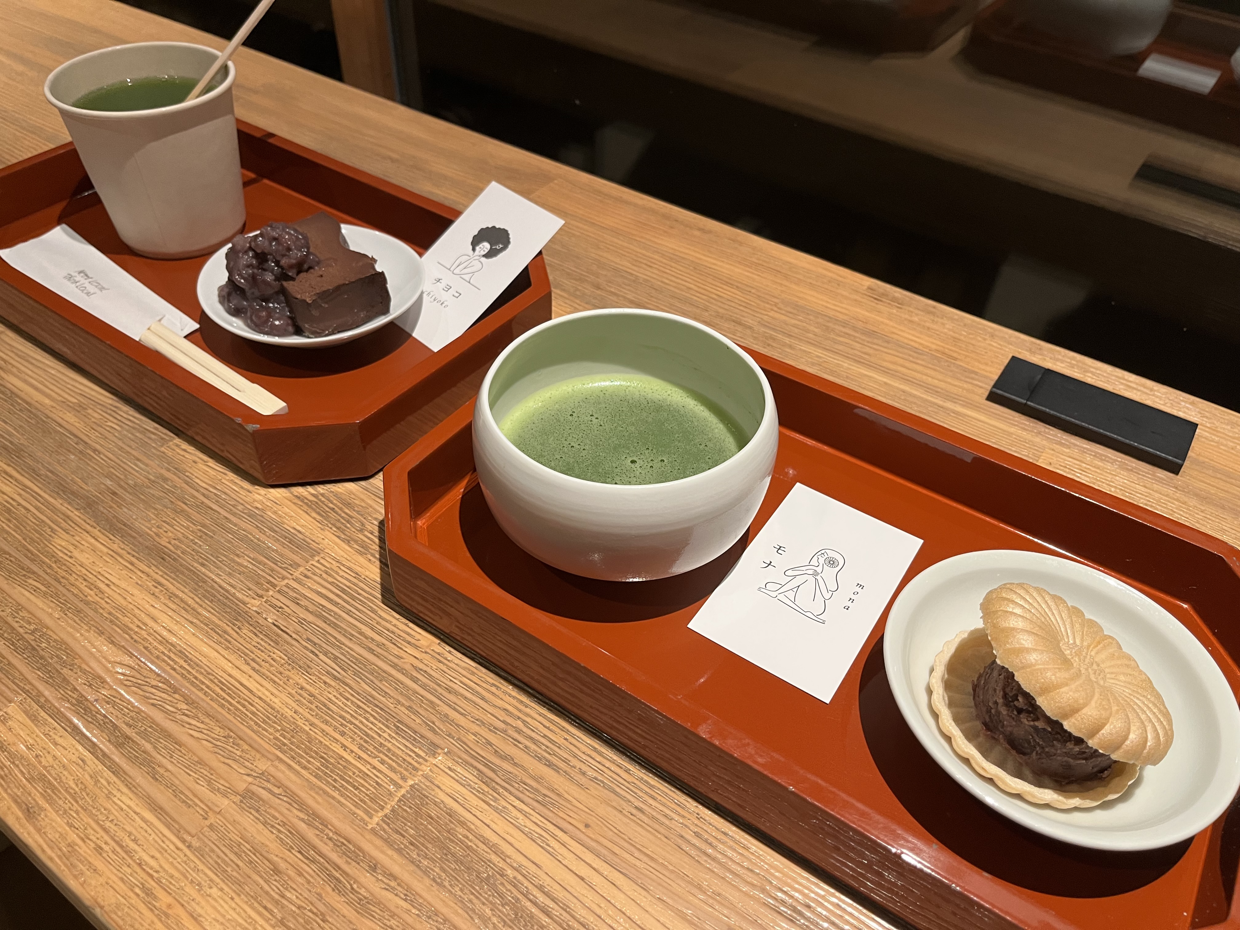 녹차랑 모나카, 꾸덕한 초코, 음료 2개를 더 시켰다.