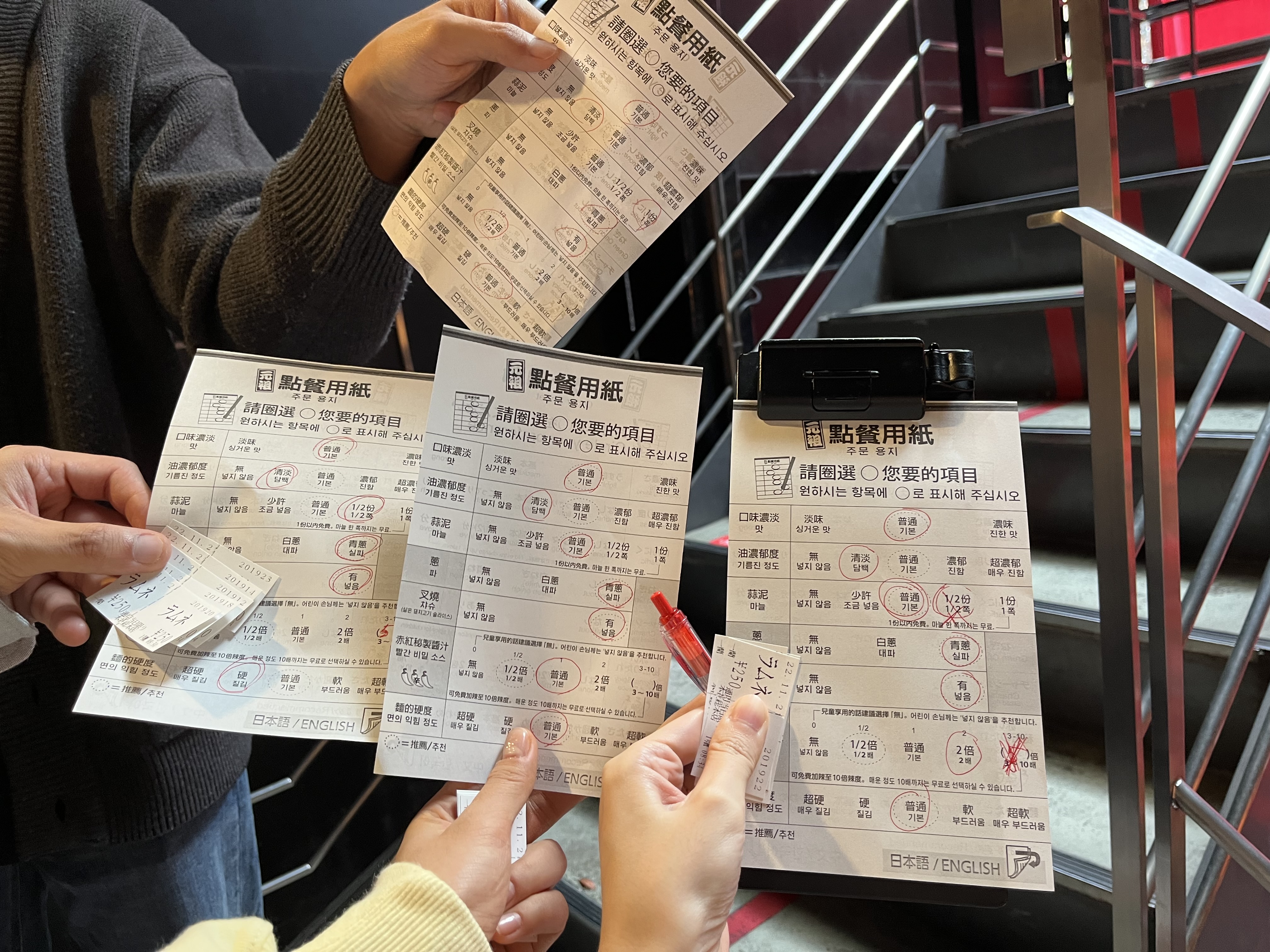 키오스크에서 주문을 하고 직원 안내에 따라 줄을 서면 그 사이 위의 사진처럼 생긴 종이를 준다. 맛, 기름진 정도, 마늘, 파, 빨간비밀소스, 면의 익힘 정도 이렇게 6가지 선택사항에서 체크하면 된다. 한국말로도 쓰여있어서 쉽게 선택할 수 있다. 여러 블로그 후기를 보니 '어떻게 먹으면 맛있더라'하고 최고의 조합이 나와있었다. 하지만 뭔가 그 조합을 그대로 따르기 보다는 내가 먹고 싶은 조합을 선택해보고 싶어서 내 임의대로 선택했다.