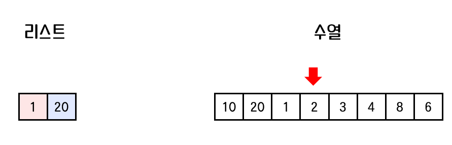 4. 리스트의 마지막 원소는 20 이다. 20과 비교했을 때, 2가 더 작으므로 이분탐색을 진행한다.