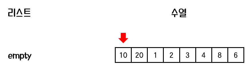 2. 리스트의 가장 마지막 원소는 10 이다. 10과 비교했을 때 20이 더 크므로 리스트의 마지막에 20을 추가한다.
