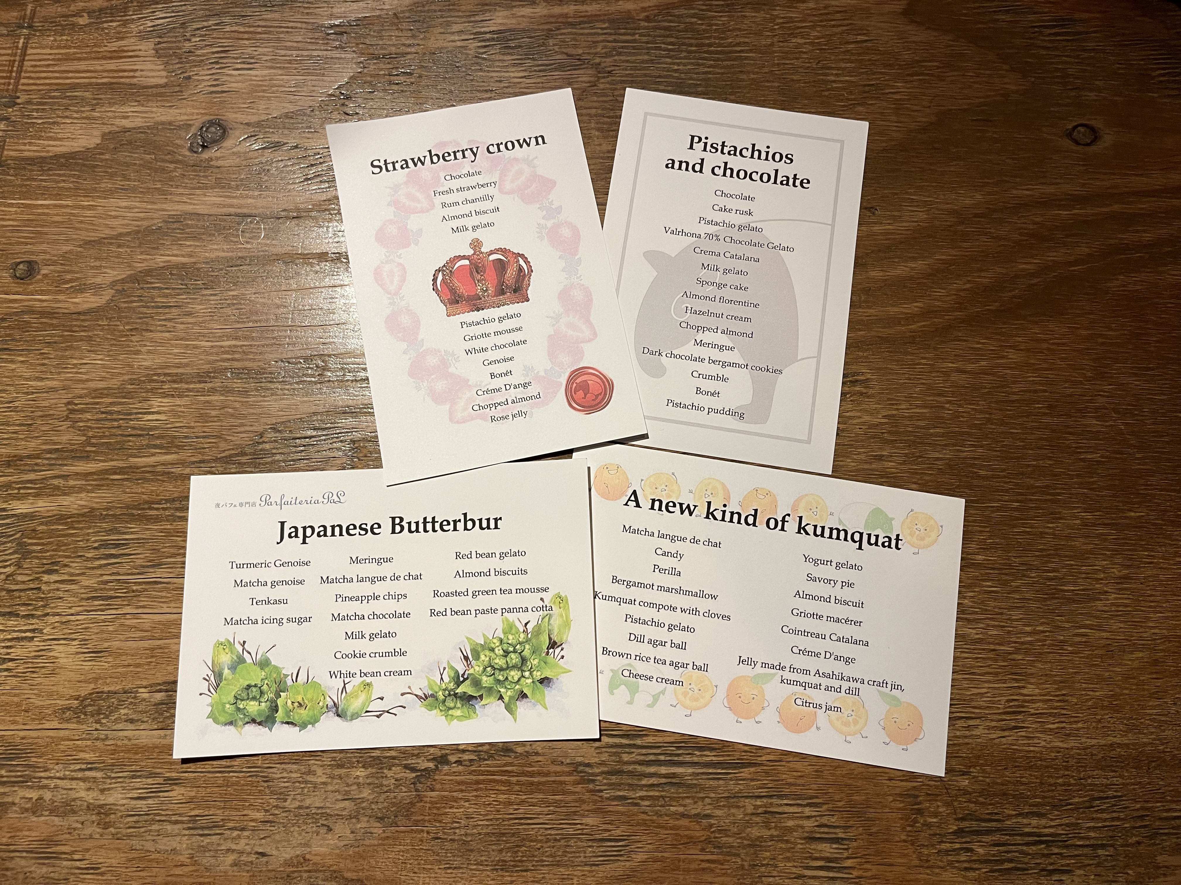 딸기맛 파르페, 초코 피스타치오 파르페, 금귤맛 파르페, 논알콜 파르페 이렇게 4개를 주문하고 나니 이렇게 각 파르페의 설명이 담긴 종이카드 4장을 받았다. 어떤 재료가 들어갔는지 씌여져 있는 것 같다. 어딘가 정성스럽고 귀여워서 사진에 남기고 싶었다.