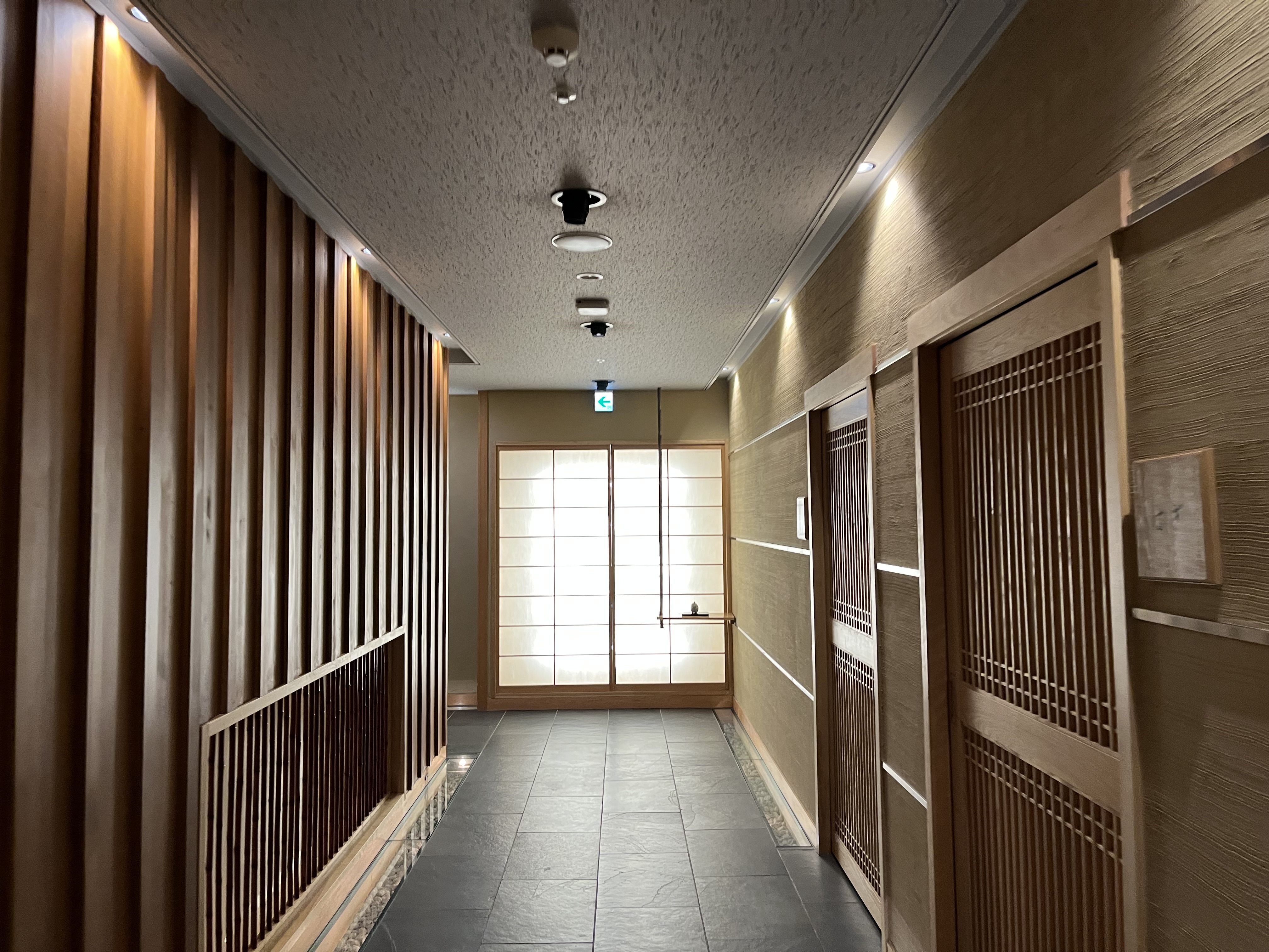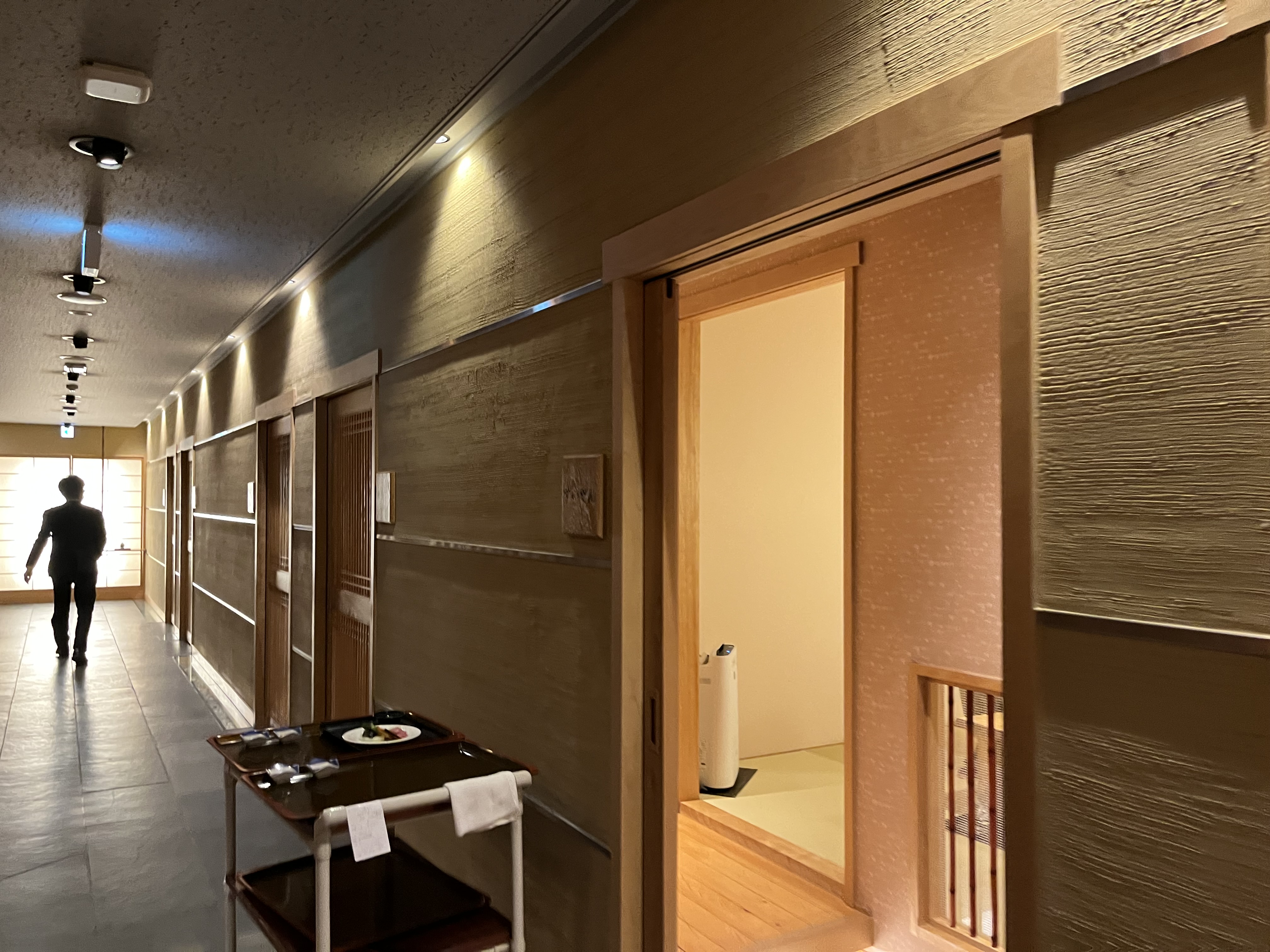 따뜻하게 목욕을 마친 뒤 유카타로 갈아입고 좀 쉬다가 가이세키 예약 시간이 다 되어서 직원분이 안내를 해주셨다. 기다란 복도를 따라 계속 어디론가 안내해주신다.