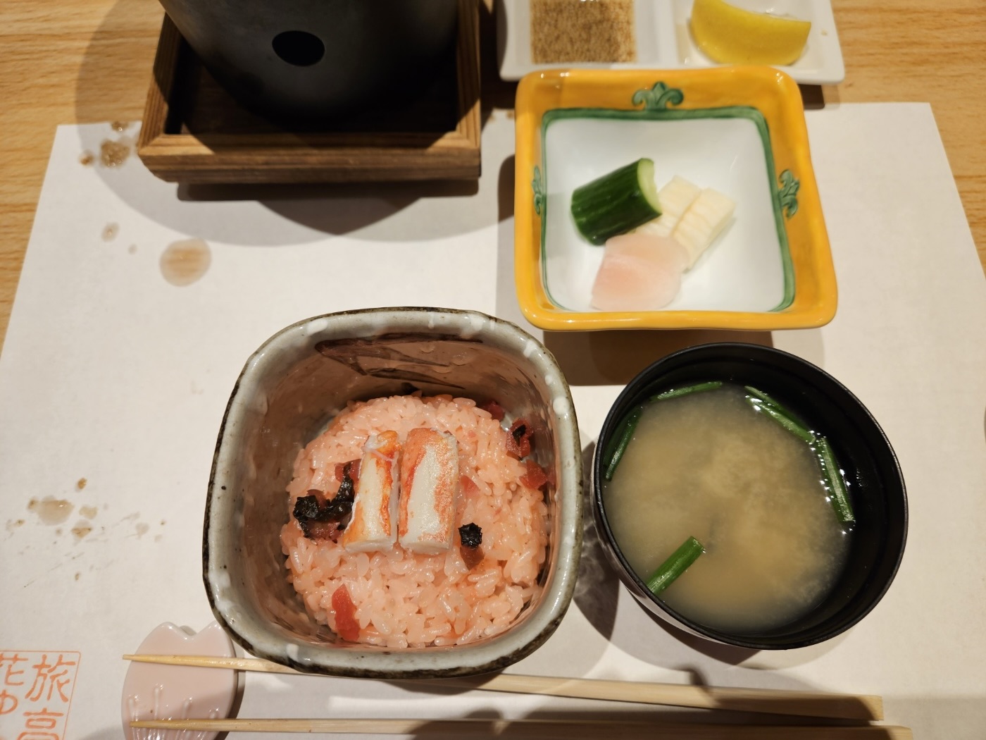 가이세키 내용이 적힌 메뉴가 일본어라서 각 음식의 설명을 일일히 알지는 못했는데 그 점은 조금 아쉬웠다. 그 다음에 나온 요리는 게살과 짠무가 들어간 분홍빛 밥과 장국이었는데 밥이 독특하고 맛이 있었다.