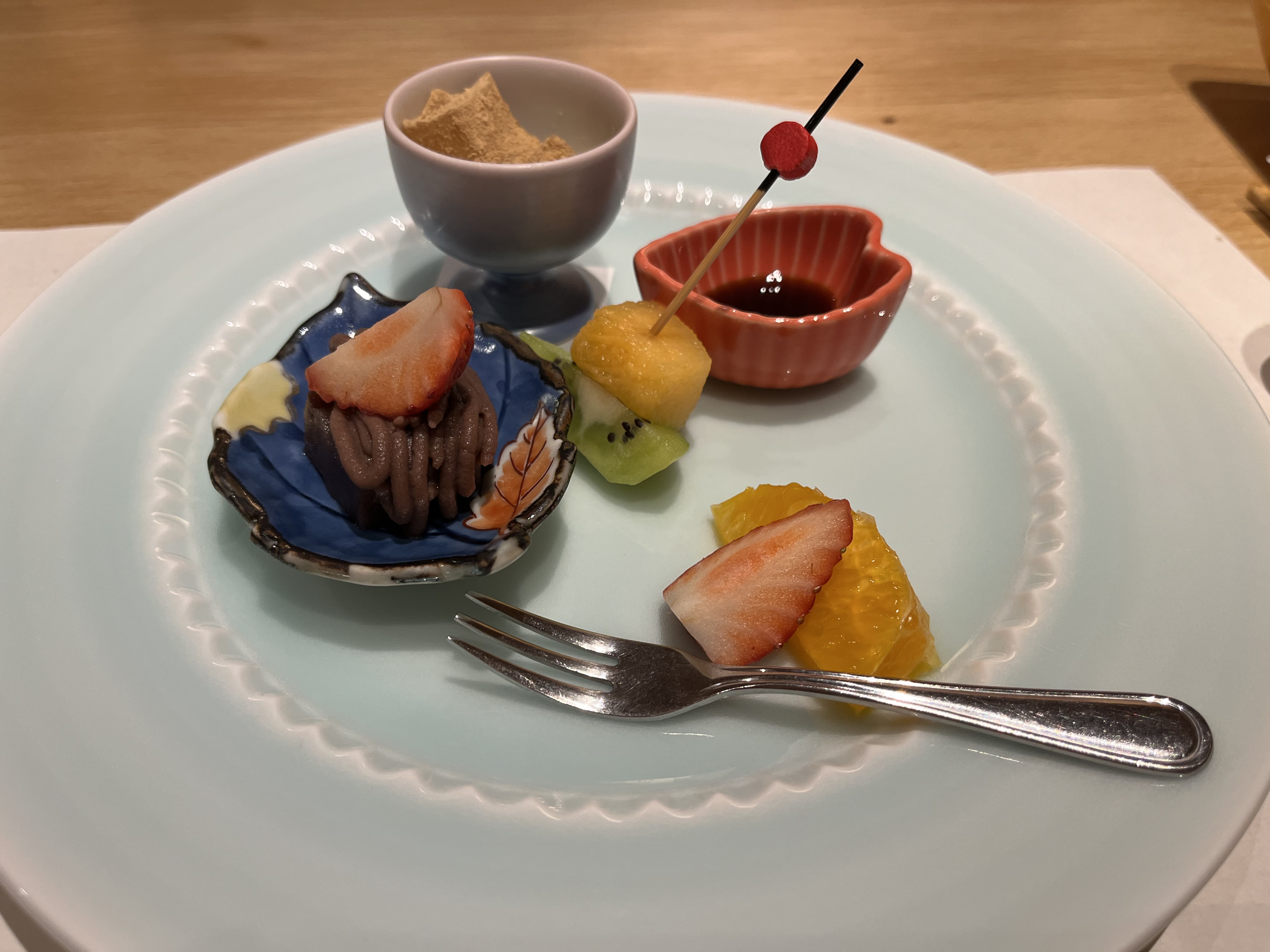 마지막으로 후식. 팥 앙금과 딸기가 올라간 디저트와 오렌지, 키위, 딸기 꼬치, 그리고 인절미 비슷한 떡까지. 원래 코스요리가 그렇듯이 조금씩 나와서 배가 안찰 것 같은데도 먹다보니 배가 불렀다.