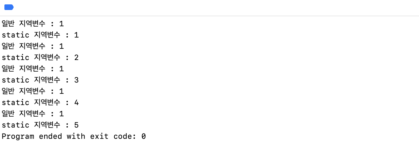 실행결과를 보면 static 변수는 함수가 호출될 때마다 ++한 결과가 누적되어 1->2->3->4->5 로 증가된다. 반면에 지역변수는 함수가 호출될 때마다 다시 0으로 초기값이 세팅되어 계속 1로 찍히게 된다.