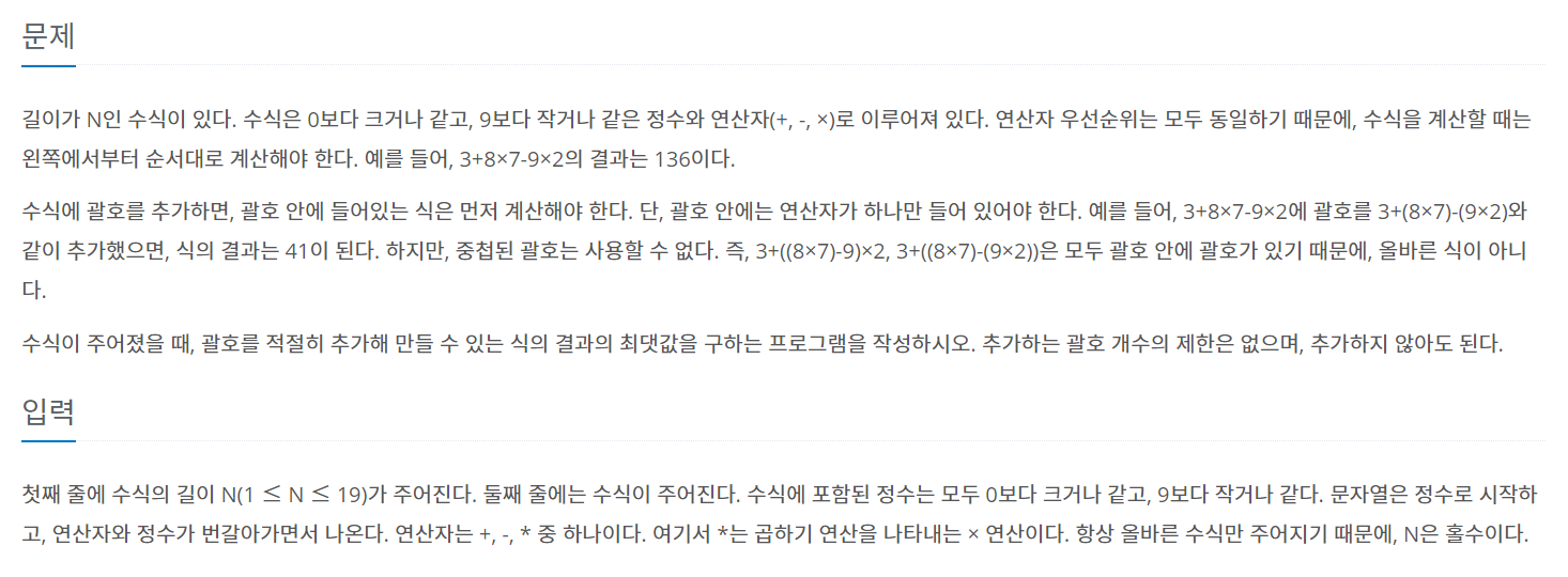 길이가 N인 수식이 있다. 수식은 0보다 크거나 같고, 9보다 작거나 같은 정수와 연산자(+, -, ×)로 이루어져 있다. 연산자 우선순위는 모두 동일하기 때문에, 수식을 계산할 때는 왼쪽에서부터 순