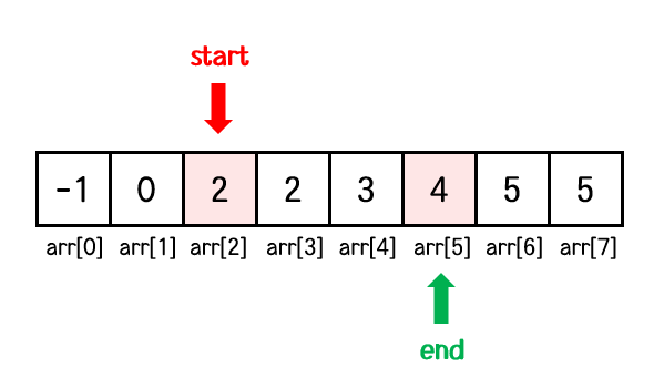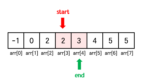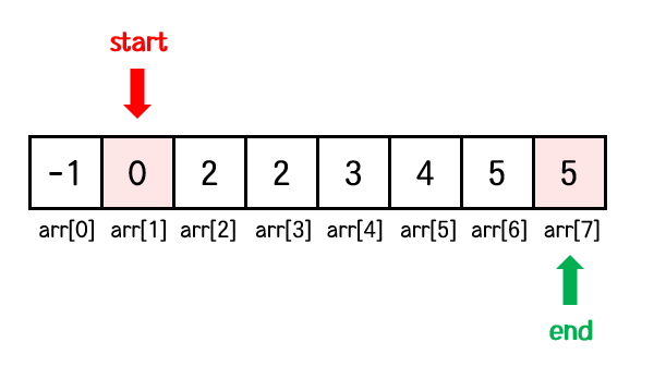 end 포인터는 제일 처음 5가 등장하는 arr[6] 바로 이전인 5 인덱스를 가리키게 된다.