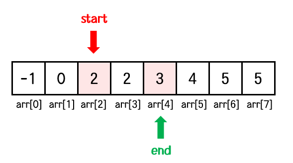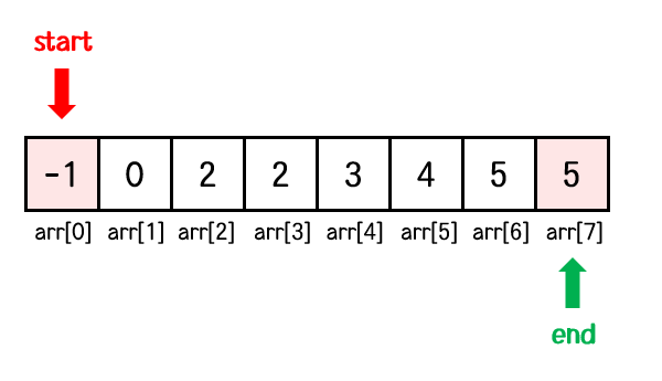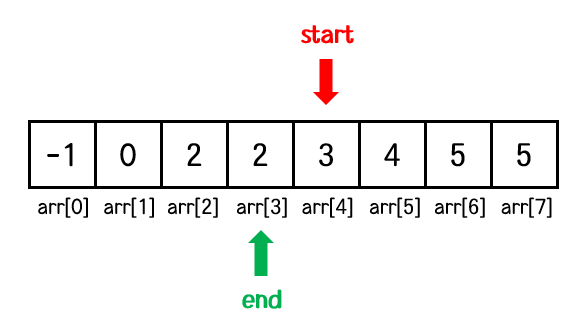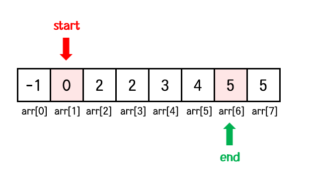 end 포인터는 제일 처음 5가 등장하는 arr[6] 바로 이전인 5 인덱스를 가리키게 된다.