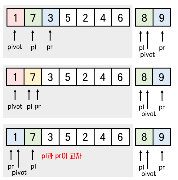 4. pl과 pr이 교차할 때까지, 즉, pl > pr 일 때까지 2,3번을 반복한다.