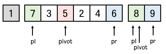 - pl은 left부터 시작하여 피벗보다 크거나 같은 값이 있을 때까지 오른쪽으로 이동한다.