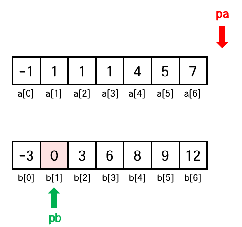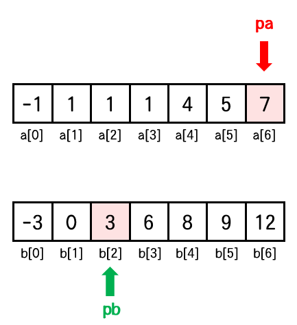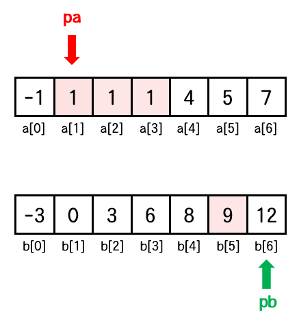 배열 a를 이동하는 포인터를 pa, 배열 b를 이동하는 포인터를 pb 라고 하면
