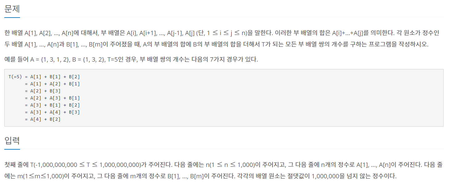 먼저 배열 A의 부분합들을 리스트에 저장한다. 배열 B도 마찬가지로 부분합을 구해서 리스트에 저장한다.