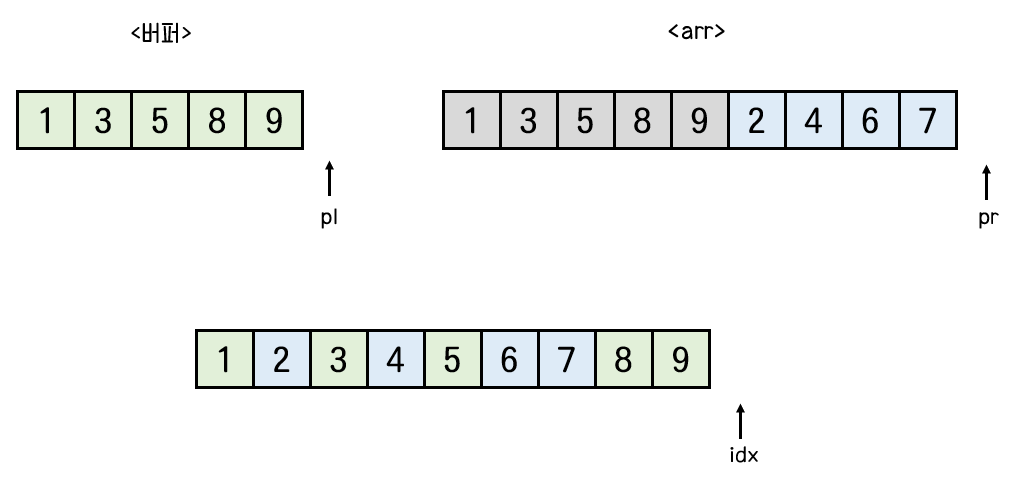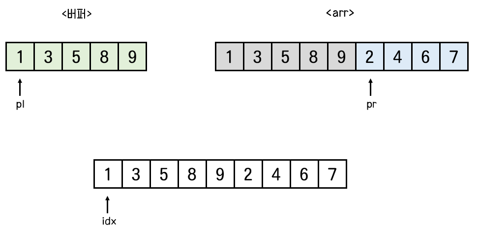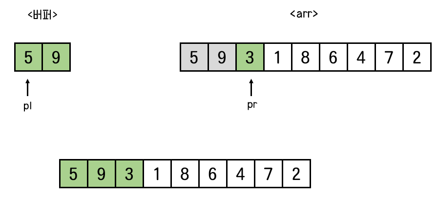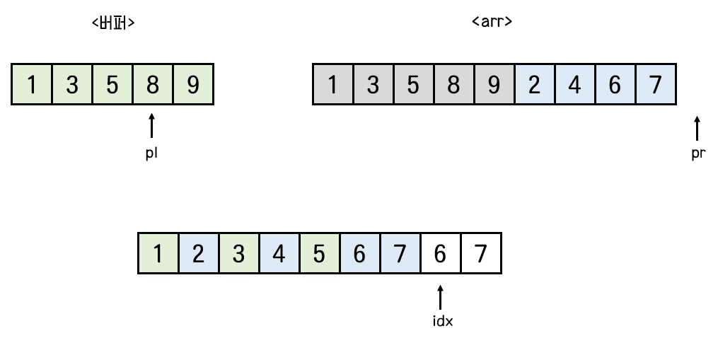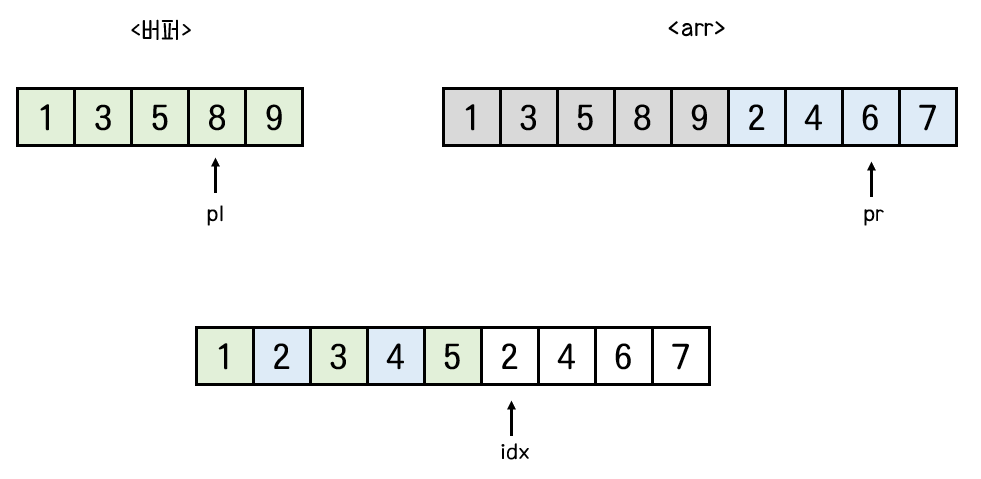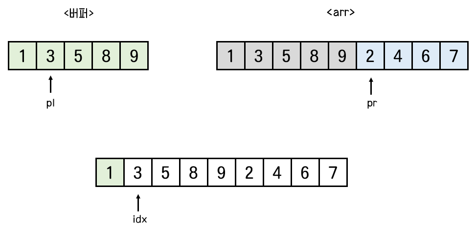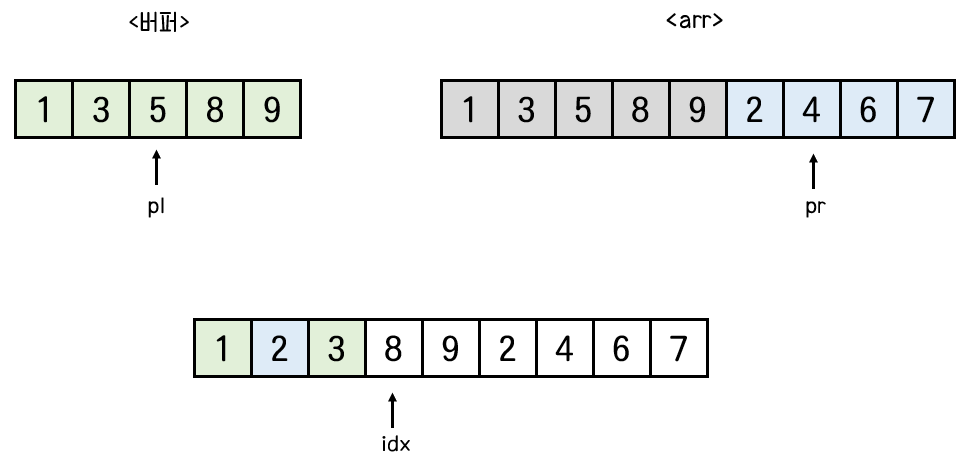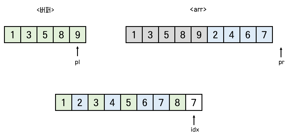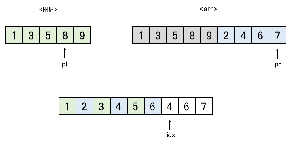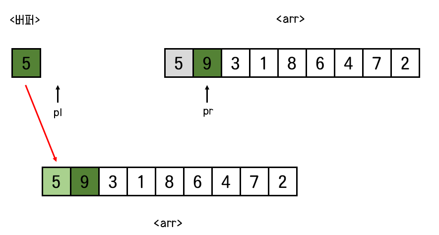 이제부터 버퍼의 pl이 가리키는 값과 arr의 pr이 가리키는 값의 대소관계를 비교하여 더 작은 값이 arr의 left부터 차례대로 담길 것이다.