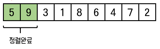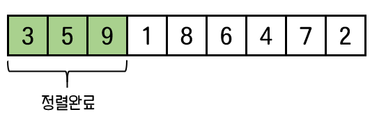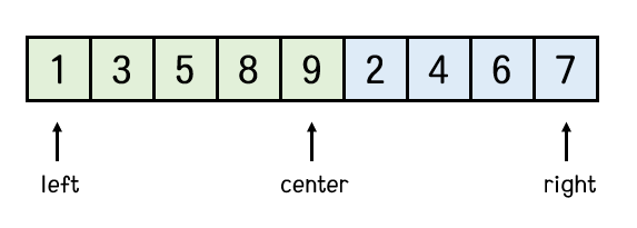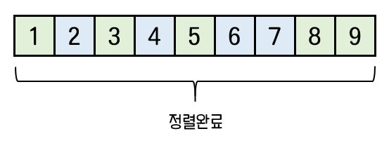 이 때, 앞쪽의 배열(초록색부분), 뒤쪽의 배열(파란색부분)은 각각 정렬을 마친 상태일 것이다.