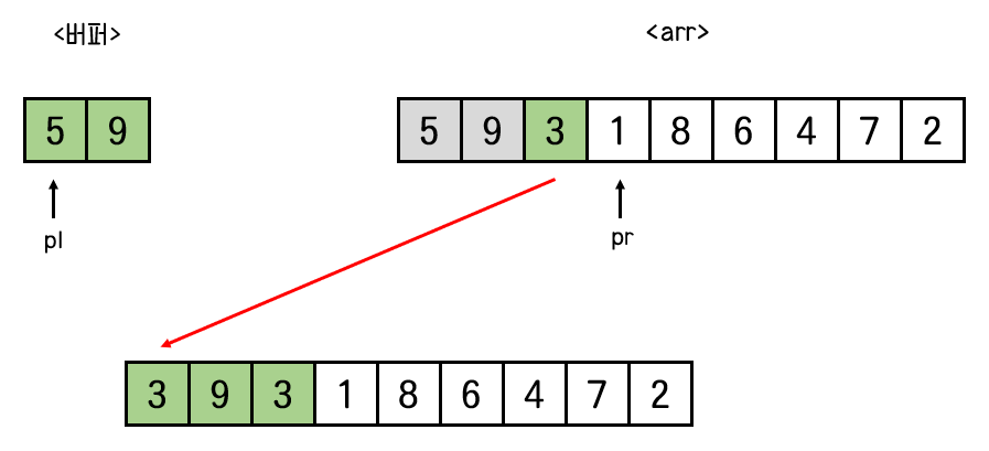 그러므로 pl을 이동시키면서 버퍼의 값들을 arr[1]부터 시작하여 차례대로 옮겨담는다.