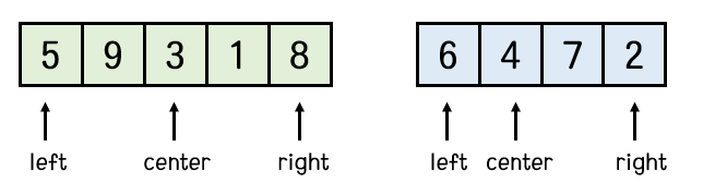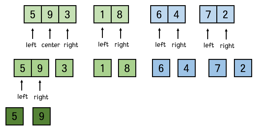 배열을 중앙을 기준으로 앞(left ~ center)과 뒤(center+1 ~ right)로 나눈다. 이 작업을 배열의 요소가 2개가 될 때까지 반복한다.