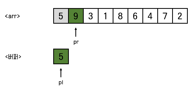 여기서는 buf[pl] < arr[pr] 이므로 arr[0] = buf[pl] = 5 가 들어간다. 그리고 pl은 하나 증가하여 1이 된다.