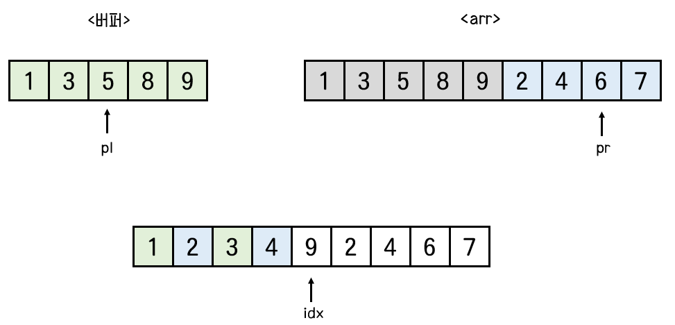 pl이 가리키는 값 > pr이 가리키는 값 -> arr[idx++] = buf[pr++];