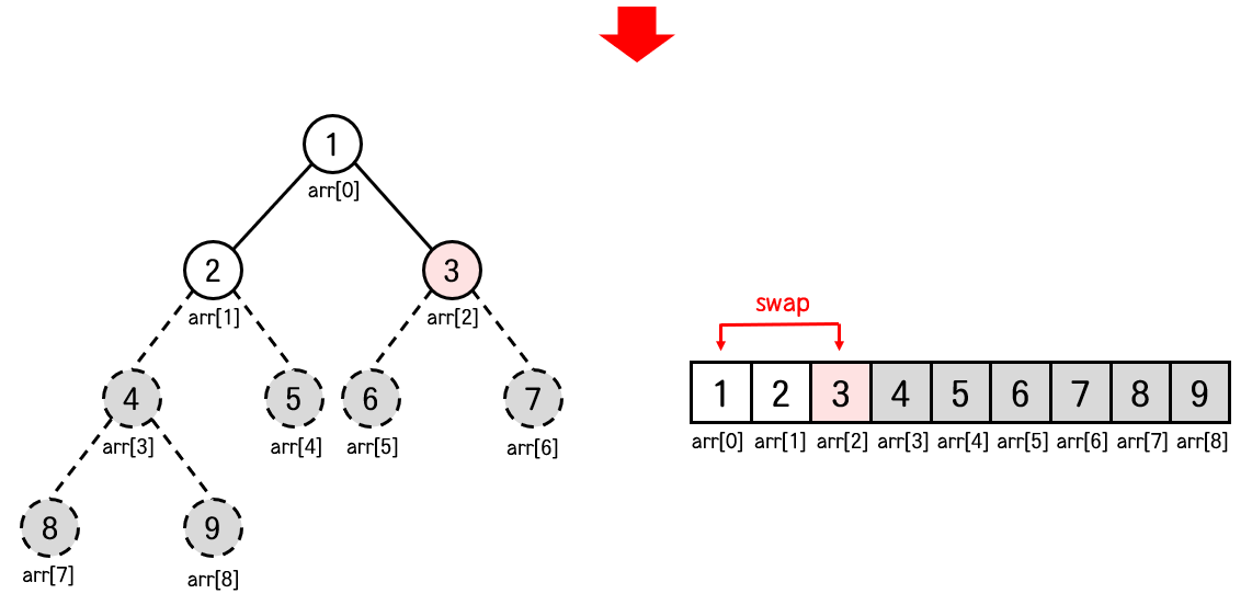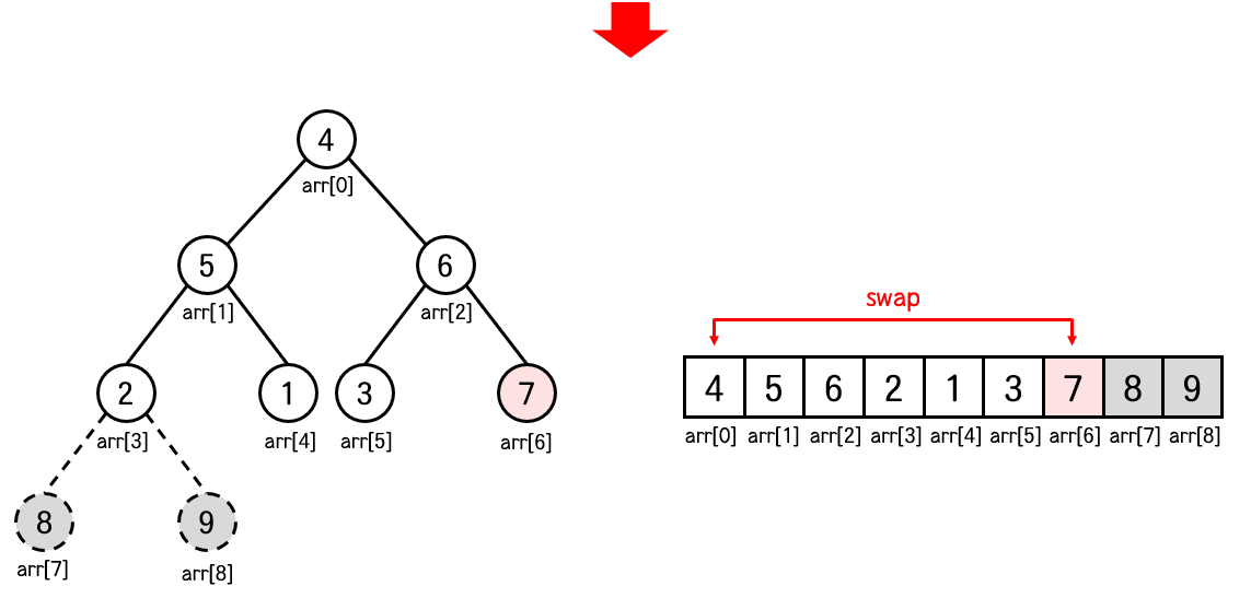 루트 노드에 있는 8을 arr[7] 로 옮기기 위해서 arr[0]과 arr[7]을 교환한다.
