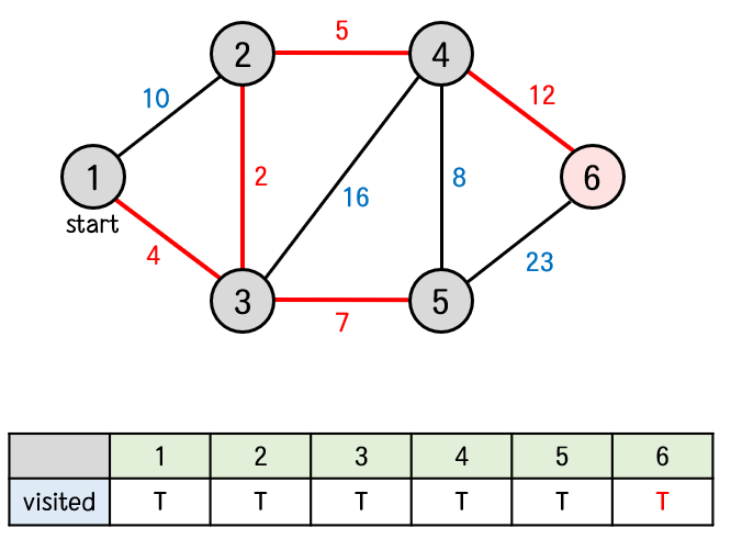 아직 우선순위 큐가 비어있지 않지만 하나씩 꺼내었을 때, 이미 모든 정점이 방문이 완료된 상태이므로 아무 작업도 하지 않고 끝나게 된다.