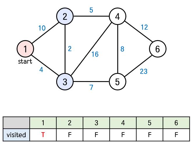 1. 임의의 start 정점을 하나 선택하여 우선순위 큐에 넣는다.