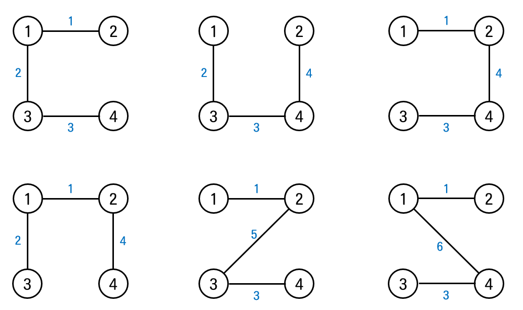 위 그래프에서 가능한 신장 트리는 아래와 같다.