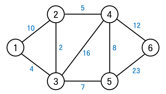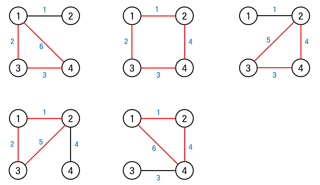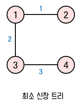 위의 그래프에서 6개의 신장 트리 중에 최소 신장 트리는 간선의 비용의 합이 6이 되는 경우이다.