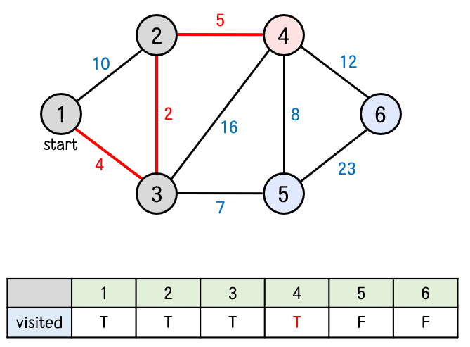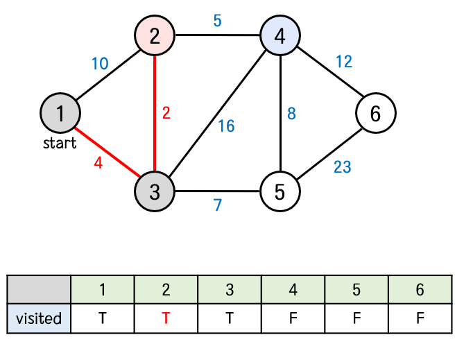 4. 우선순위 큐에서 꺼낸 정점이 아직 방문하지 않은 정점이라면, 방문처리를 하고 정점의 비용을 더한다.
