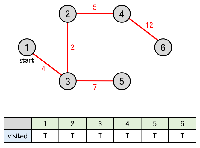 모든 정점을 방문하였으므로 sum 에 들어있는 값이 최종 최소 신장 트리의 간선 비용 합이 된다.