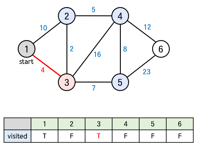 3. 간선 비용의 총 합을 구하는 변수 sum에 정점 3번의 비용인 4를 더한다. -> sum = 4