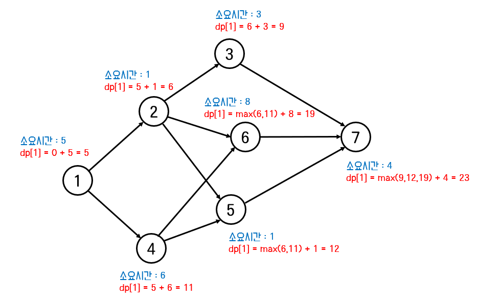 아래 그림은 백준 2056번 문제 예제를 나타낸 것이다.
