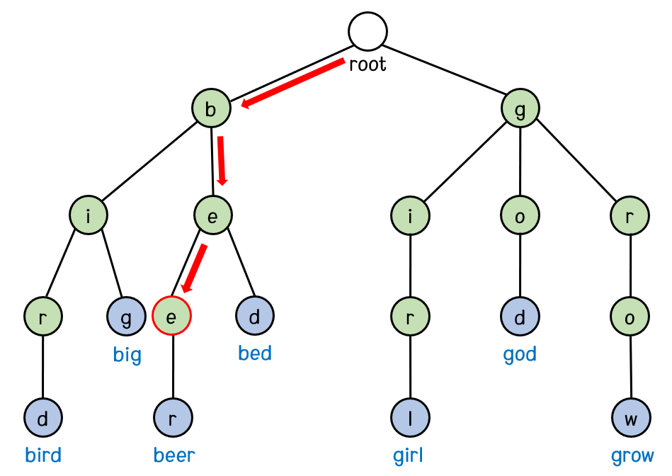 그런데 마지막 노드의 isLastChar = false 이므로 "bee"는 포함되어 있지 않다고 봐야한다.