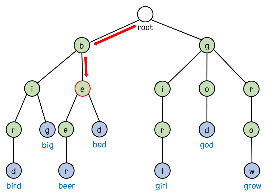 그 다음, 'b'의 자식 노드 중에 "bed" 의 두번째 문자인 'e'가 있는지 확인해본다.