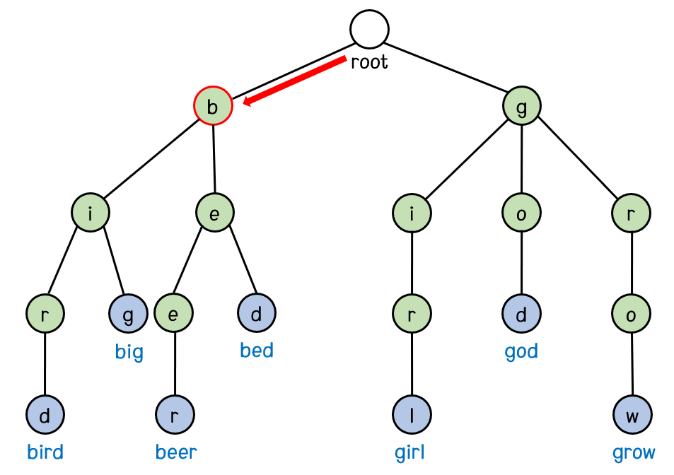 루트 노드부터 시작하여 아래로 내려가면서 단어의 첫번째 문자부터 트리에 포함되는지를 확인한다.