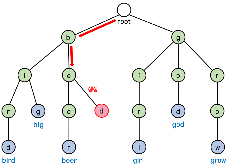 예를 들어 위의 트라이 그림에서 "bed" 라는 단어를 삽입한다고 하자.
